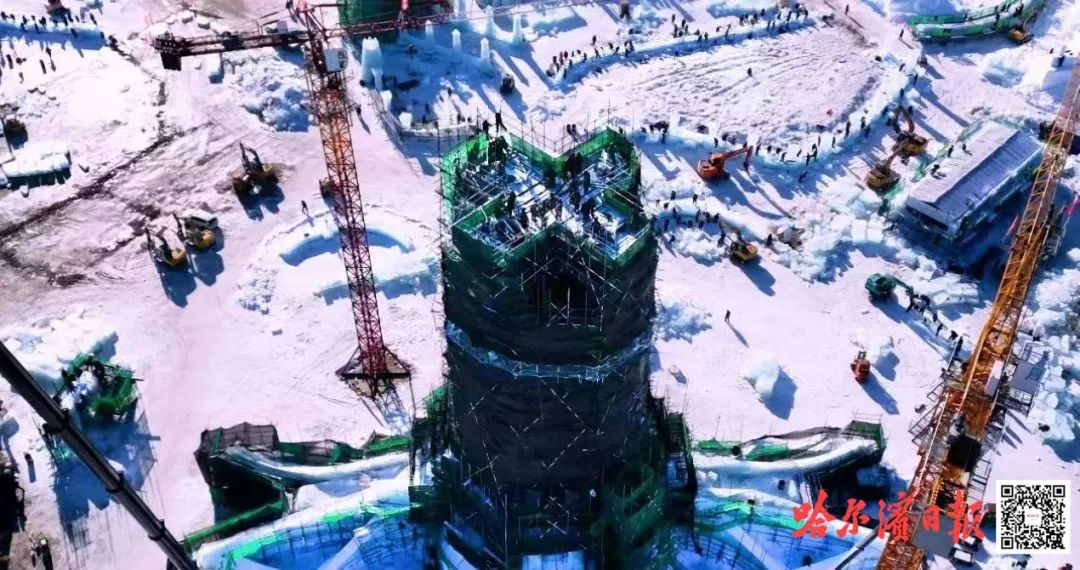 今年的主塔“冰雪之冠”高41米,用冰量11000立方米,设计及施工难度均超过往届。“冰雪之冠”的主体为冰雪丰碑,由24根冰柱向上集聚而成,象征着第24届冰雪大世界;主塔布局以哈尔滨的市花——丁香花为设计原型,花瓣簇拥组成王冠形状,高大巍峨,神圣庄严,象征着哈尔滨人奋勇前进、不甘人后的拼搏精神;主塔平台以八分音符为元素抽象设计,代表着作为世界六大“音乐之都”的哈尔滨,是亚洲唯一获得联合国授予“音乐之都”的城市。为了今冬如期开园迎客,在严格落实各项疫情防控措施的前提下,参与施工的建设者们战冰雪、斗严寒,昼夜施工,努力克服一切困难,保质保量完成园区建设。在哈尔滨冰雪大世界园区建设现场,冰建工人、雪雕匠人、电工、特种设备操作工、技工、安全员、监理等千余人在紧张有序地忙碌着。