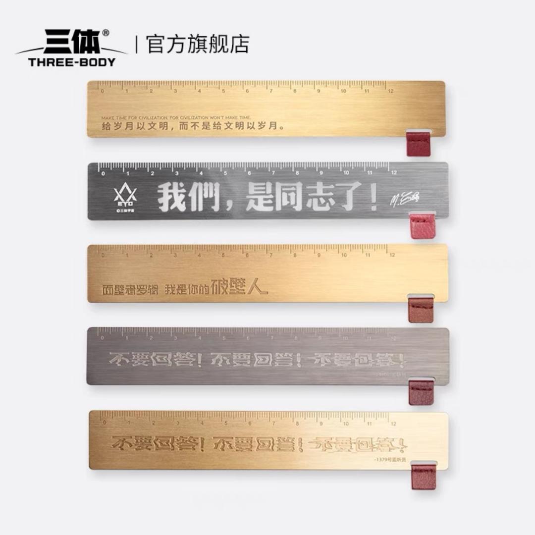 在这种情况下,三体宇宙推出的周边衍生产品会更多凸显《三体》的标识或者金句,甚至是利用这些金句来“玩梗”。三体官方旗舰店曾经推出过一组书签,书签上的内容基本都是《三体》小说中的金句,包括了“我们,是同志了”、“给岁月以文明,而不是给文明以岁月”以及“藏好自己做好清理”等等。