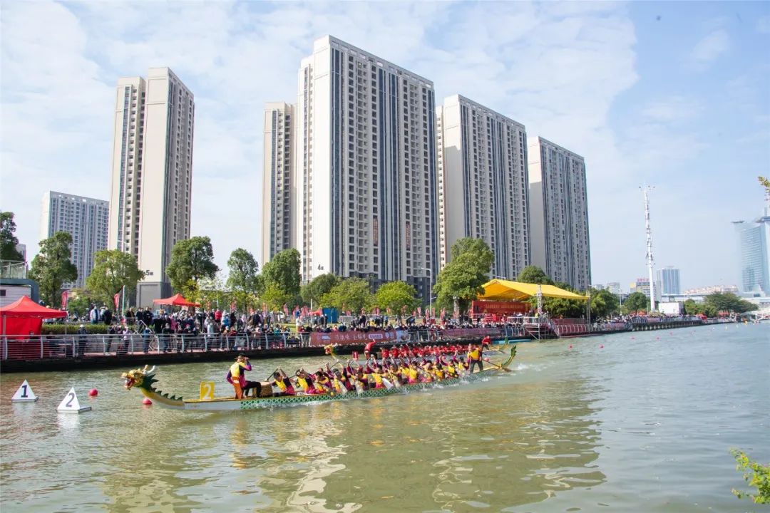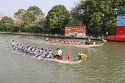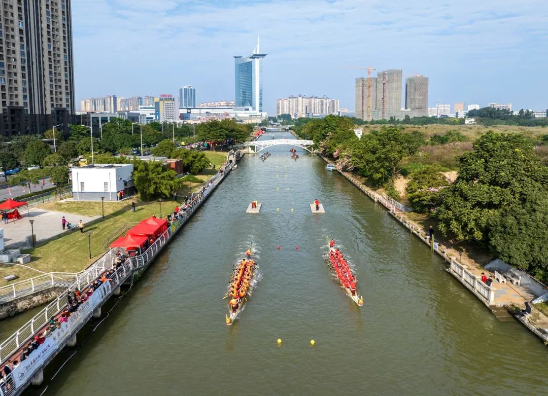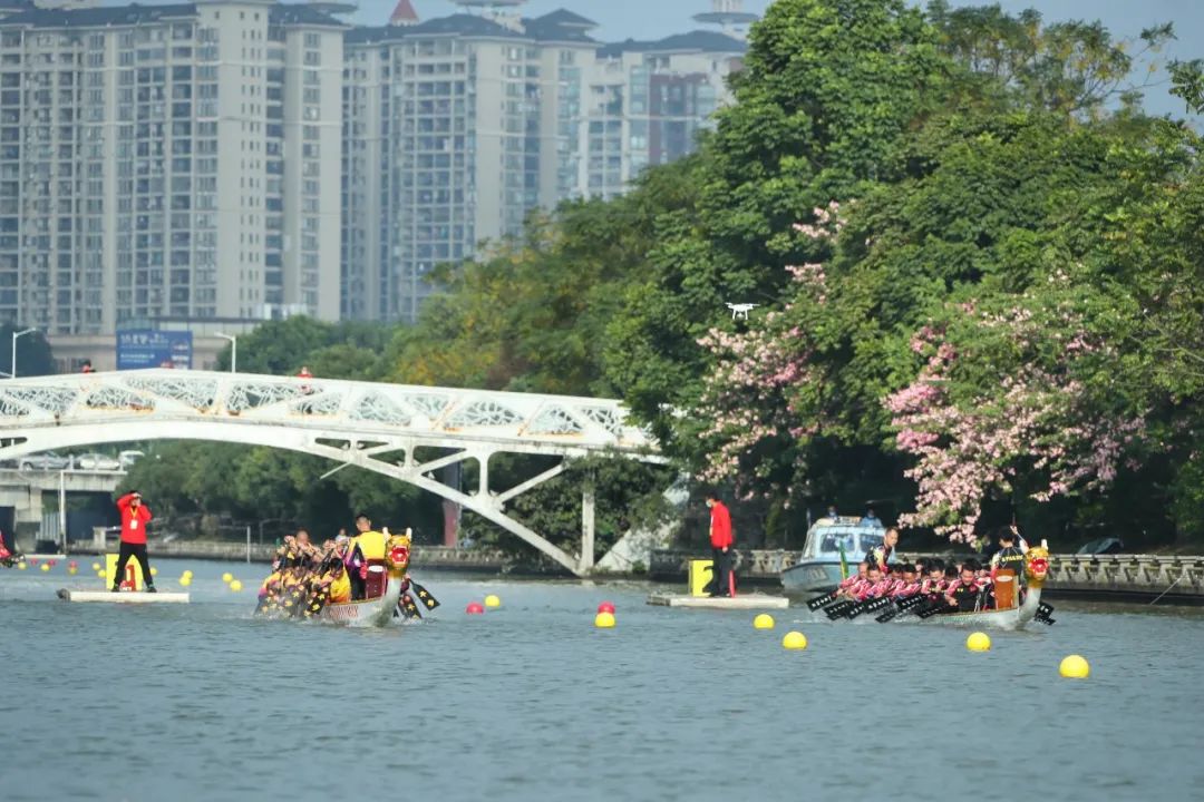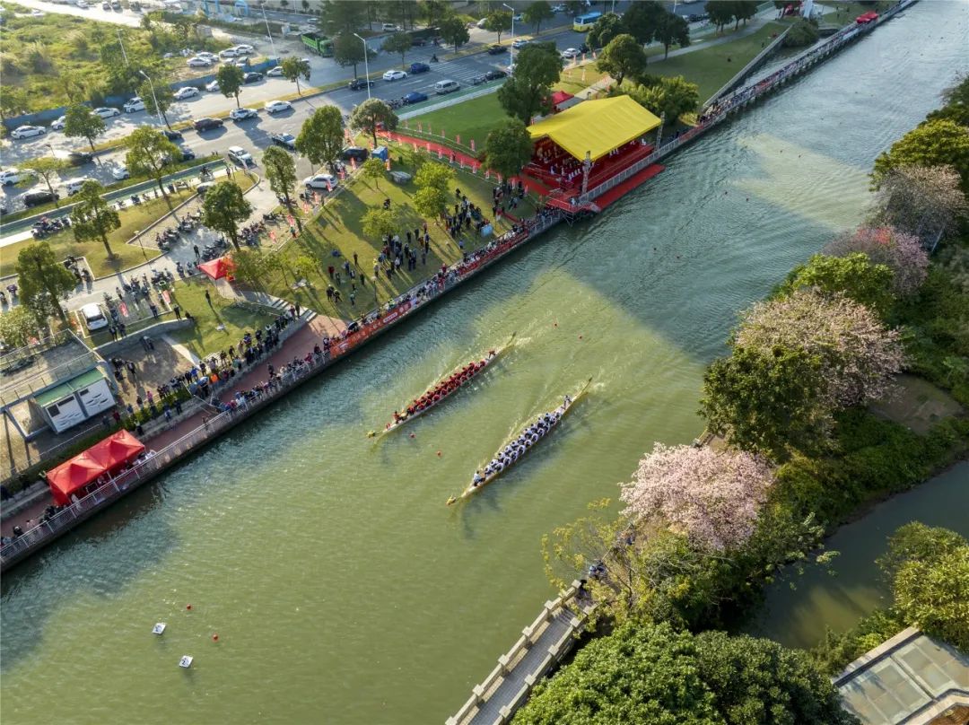 河面上激烈竞逐的龙舟,与沙良河公园优美的自然风光浑然一体,相得益彰,展示着顺德美丽宜人的城市环境和浓厚的文化氛围。