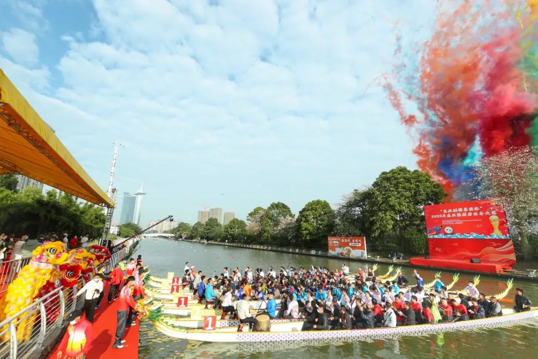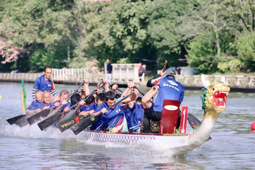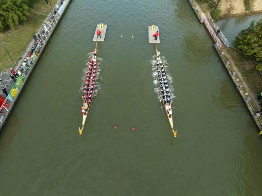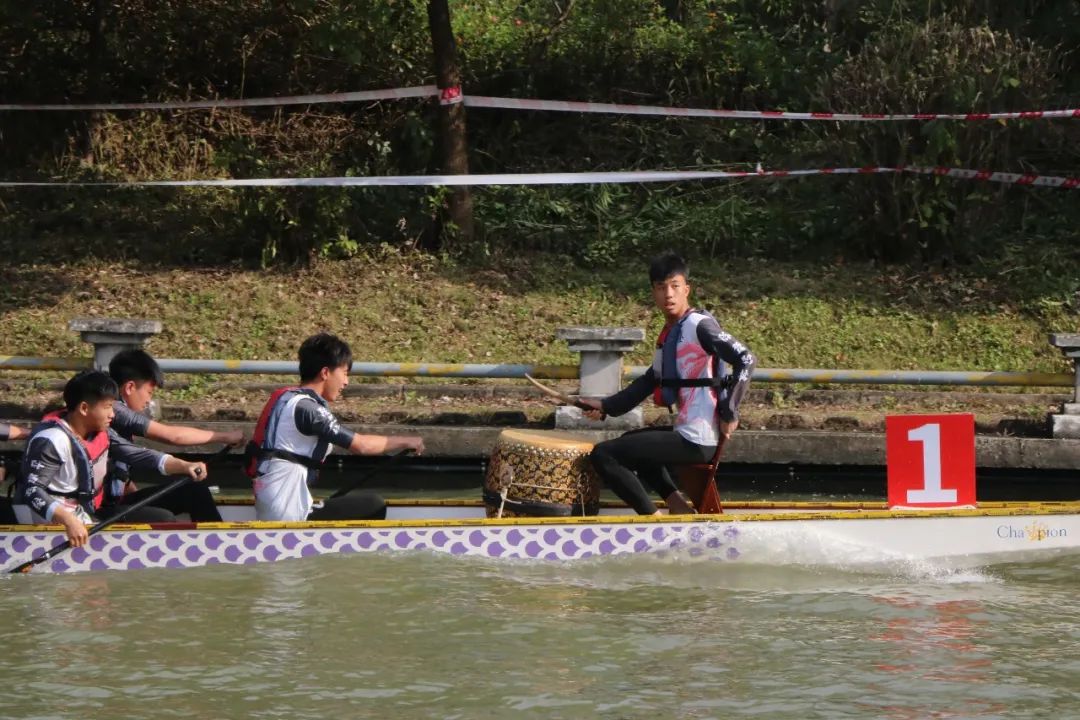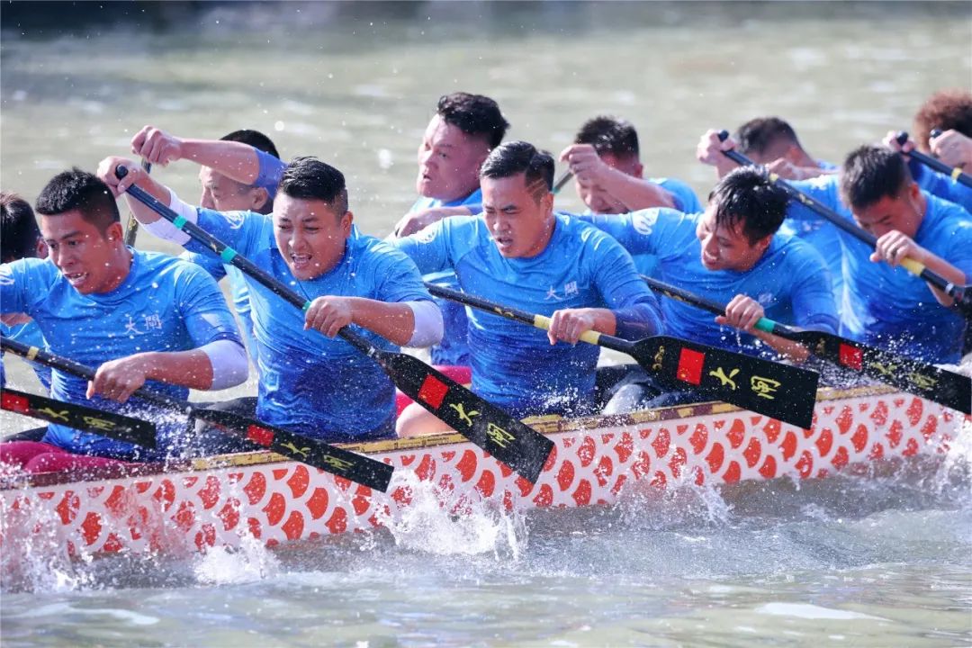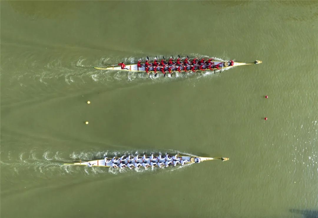 河中鼓点声声,运动员随着鼓点、喊着号子,挥动船桨,铆足劲、齐发力,划向终点。