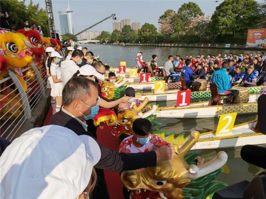 碧波之上,各支龙舟队伍整装待发。出席活动的领导嘉宾们纷纷手持朱砂笔,为参赛龙舟进行点睛仪式,祝愿龙舟健儿们在赛事中取得好成绩,赛出风格,赛出精彩。
