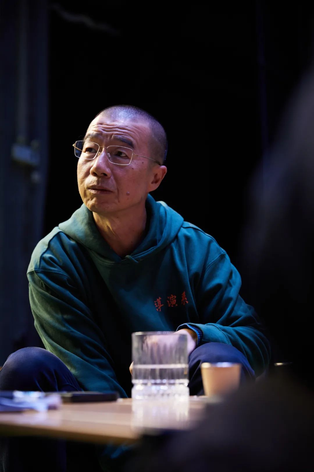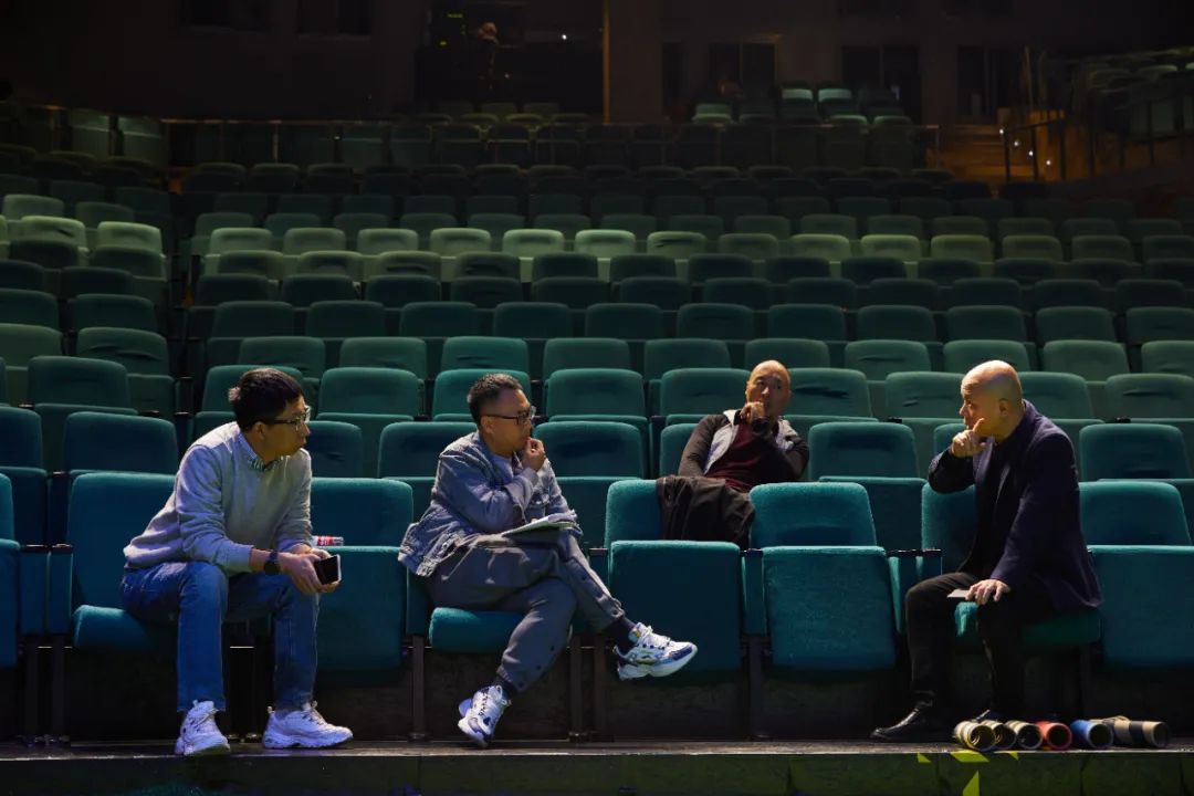 进入剧场,巨大的黑色幔布分隔出一块诗意的草地,新老朋友相聚于此。幔布背后,隐藏着数个工作间,数十名工作人员悄无声息地进出,镜头内外是无数个背影的奔忙。暖黄色的灯光照下来,丁丰、余青峰、叶青林、梁碧波四位老师对坐指导。