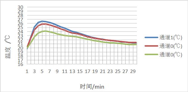 图为吸湿发热测试过程中温度变化曲线图该样品吸湿发热测试中最高升温值为 6.3℃,30min 内平均升温值为 3.4℃,符合标准要求,可称之为具有吸湿发热性能。