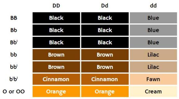 B基因的每种可能的组合对毛色的影响|Messybeast第二类就是红色系。由产生褐黑素Pheomelanin的基因控制,称为O基因,一共有O、o两种基因型。有O型基因的猫会产生褐黑素而呈现出橘色;o型基因的猫则不会产生褐黑素,其颜色则取决于它们携带的B基因组合。