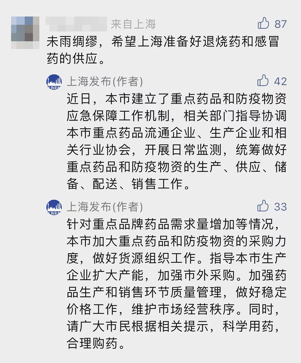 也有网友留言:未雨绸缪,希望上海准备好退烧药和感冒药的供应。对此,上海发布回应称:近日,本市建立了重点药品和防疫物资应急保障工作机制,相关部门指导协调本市重点药品流通企业、生产企业和相关行业协会,开展日常监测,统筹做好重点药品和防疫物资的生产、供应、储备、配送、销售工作。