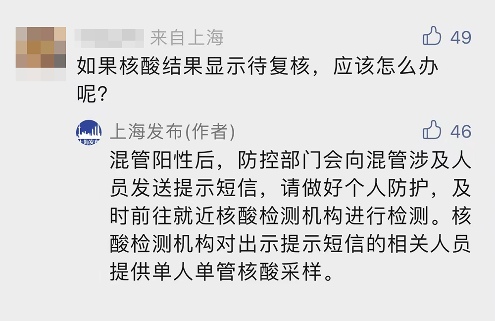 12月13日,上海发布公众号发布《上海市新型冠状病毒肺炎疫情每日报告》。有网友提问:如果核酸结果显示待复核,应该怎么办呢?对此,上海发布回应:混管阳性后,防控部门会向混管涉及人员发送提示短信,请做好个人防护,及时前往就近核酸检测机构进行检测。核酸检测机构对出示提示短信的相关人员提供单人单管核酸采样。