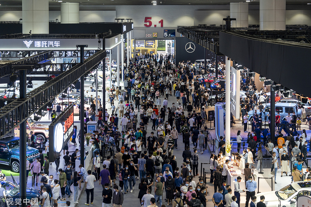 2021年11月21日,中国广州,第十九届广州国际汽车展在琶洲展馆召开,开展第二天,观众络绎不绝,现场气氛火爆。视觉中国 资料图