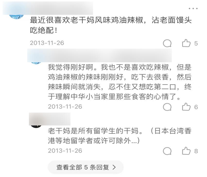 第一组评论的时间是2013年,当时的老干妈在消费者中的口碑依然稳固,蘸辣椒酱吃馒头是那一代人普遍的回忆。