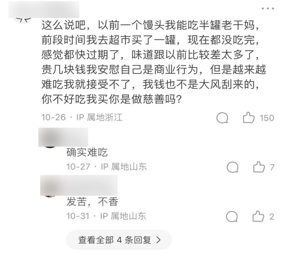 第二组评论的时间是今年10月份,皆是负面情绪:一是觉得现在的老干妈,味道和过去的没法比。二是不仅没法比,价格还涨了不少,拿消费者当冤大头。甚至还有人评论辣椒酱的味道发苦。辣椒本辣,“发苦”一词,很难说不是对老干妈辣酱的一种侮辱。