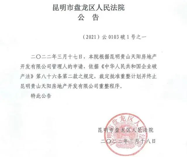 2021年4月,法院裁定受理贵山天阳公司的破产重整申请;2022年2月,第二次债权人会议通过了重整计划(草案);3月,贵山天阳公司的重整计划被批准。