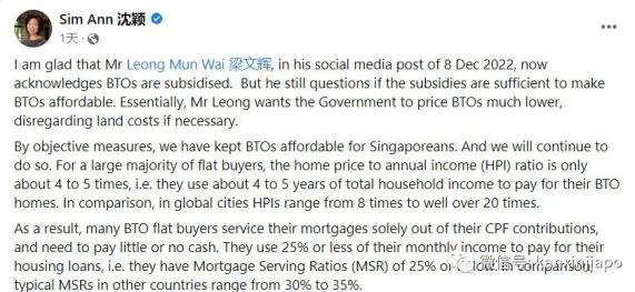 同时他还说道,他认为组屋的定价不应该考虑土地成本,因为建屋局单位的大部分土地都是由建国一代以相对适度的金额交给政府的。然而现在却只能拿土地费用五分之一的折扣,以市场价格去支付本该属于新加坡长辈们的土地。另外一位议员沈颖则在昨日发FB(12月12日)回应了梁文辉。