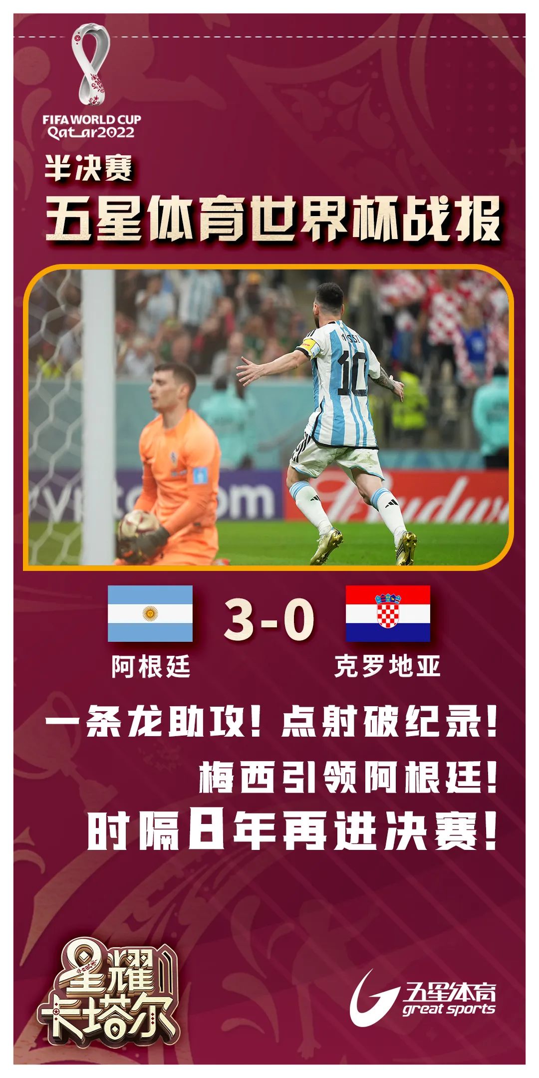 梅西和阿尔瓦雷斯,相差13岁的两个人,左右了这场阿根廷队与克罗地亚队之间的半决赛的走向。两人联手包揽整场比赛的3粒进球,让“潘帕斯雄鹰”飞入决赛!