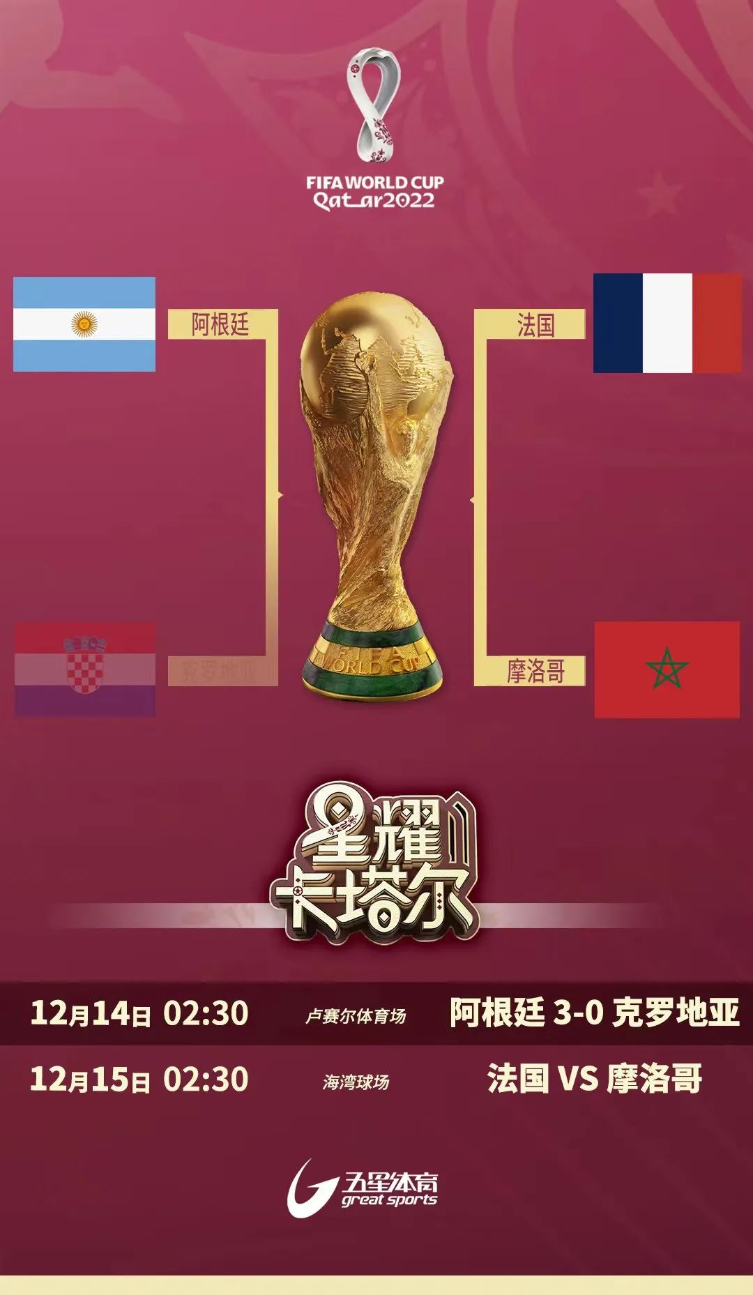 四年前在俄罗斯,克罗地亚队的三粒进球将阿根廷队直接送到了后来夺冠的法国队面前,那场1/8决赛阿根廷拼劲了全力也吃尽了苦头,最终还是没能再进一步。四年后来到卡塔尔,两队相遇的时间晚了一些,决赛门外,高手过招!