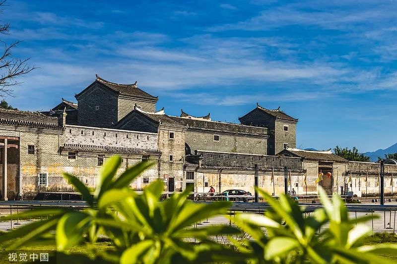 △韶关始兴满堂围。/视觉中国古建筑向来有一种古朴的美感,客家人曾在韶关留下另一种层层叠高的五凤楼,屋檐弯弯翘起,青灰色瓦片映衬着砖红栏杆,粗壮的横梁穿过堂屋,整座建筑既庄严又翩翩欲飞。