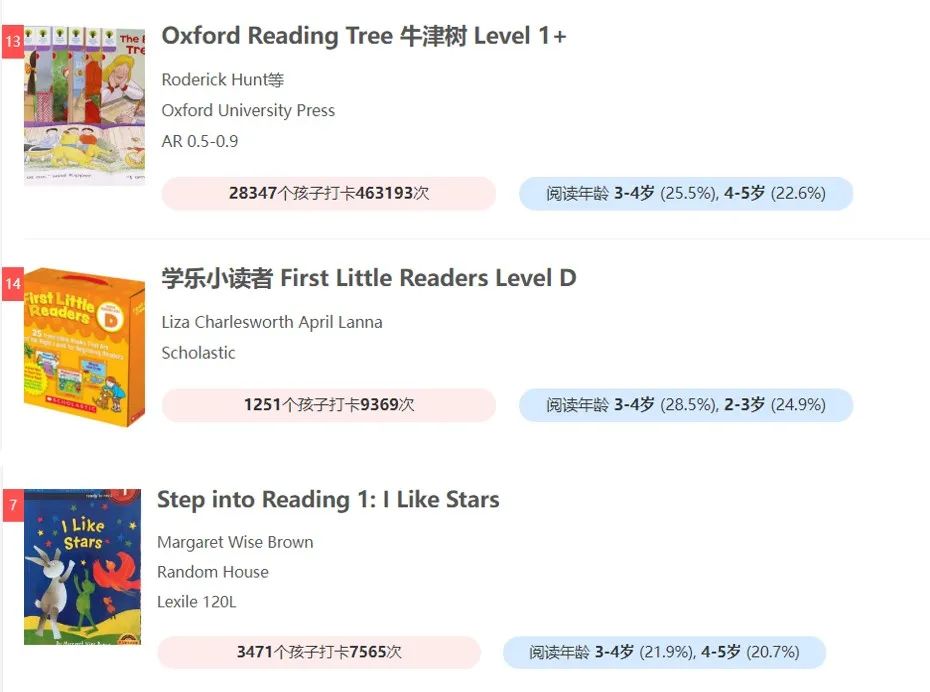 解决高频词后孩子可以自读低阶分级了。由于分级买太多,主流的raz、红火箭、牛津树家庭版、牛津树学校版;我的第一套图书馆系列、Step into Reading 、培生、学乐小读者系列,I can read系列。还有一些非主流的什么新东方威尔小镇、麦克米伦出版的美国少儿分级阅读(这套分级虽然冷门,但是内容编写的太好了,有思维拓展,太省妈了)还有外研社的丽声系列等等。