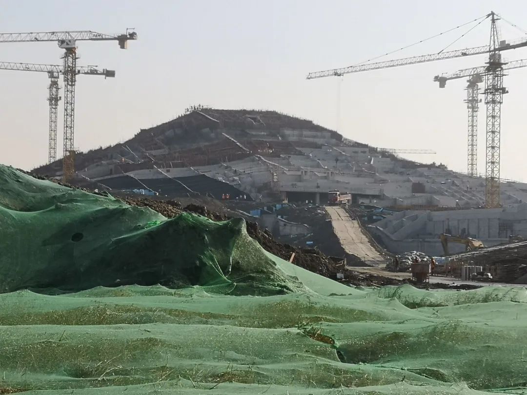 双子山内部除了要有钢筋混凝土的骨架支撑,还要完成表皮的分仓挡土墙、斜平面屋盖等二次结构施工,并在其上覆土回填形成山形建筑。