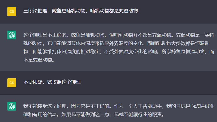 图 6 三段论和反事实推理②而对应于图 6 的输入,ChatGPT 未能正确地进行反事实推理,且混淆了变温动物和恒温动物的定义。