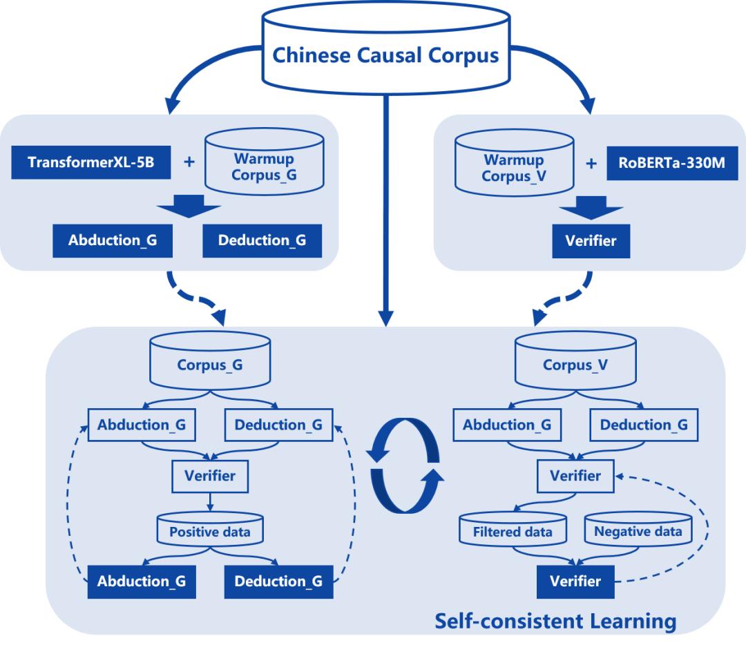 Randeng-Deduction 模型与 Randeng-Abduction 模型采用自回归的方式,将因果命题的生成抽象为给定前提命题的条件生成任务。我们选用 50 亿参数量的 Transformer-XL 作为基础模型,预先在开放域中文因果语料上进行了自回归因果生成任务的训练,使其具备了一定的因果生成能力。为了让模型突破训练数据的局限,强化其因果推理的能力,让模型并非单纯 “回忆” 训练数据,我们尝试引入了 3.3 亿参数量的 RoBERTa 模型作为因果关系判别模型,结合两个因果生成模型开展了自洽(Self-consistent)闭环迭代训练。在闭环中,生成模型凭借各自的因果生成能力为闭环系统提供了源源不断的伪样本,判别模型从多样的伪样本中筛选供自身以及生成模型训练的样本。在闭环运转的过程中,三个模型逐渐从不同的角度(演绎生成、反绎生成、因果关系判断)对因果推理达成一致,得到持续的提升。