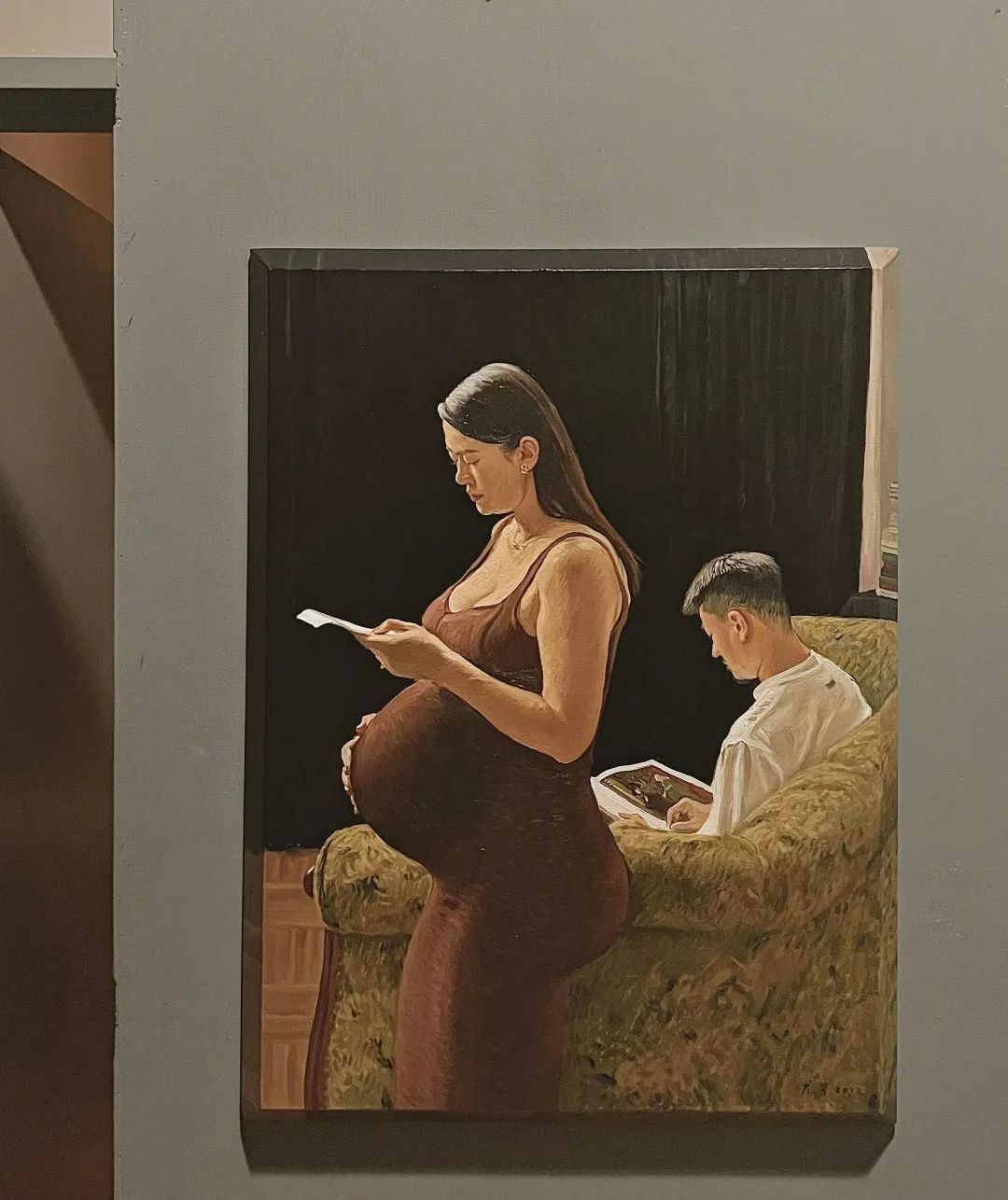 最近尤勇为待产的夫妻朋友创作了一幅日常小画,画面最显眼处挺着孕肚的女士侧立,肚子圆润得像个半球,背部曲线玲珑有致。她正一手扶着孕肚,一手拿着信纸低头阅读。旁边沙发上坐着她的先生,光从他们头顶洒下来,在她圆滚的孕肚边形成了一圈金边。整个画面饱满,带着宁静、温馨的氛围。