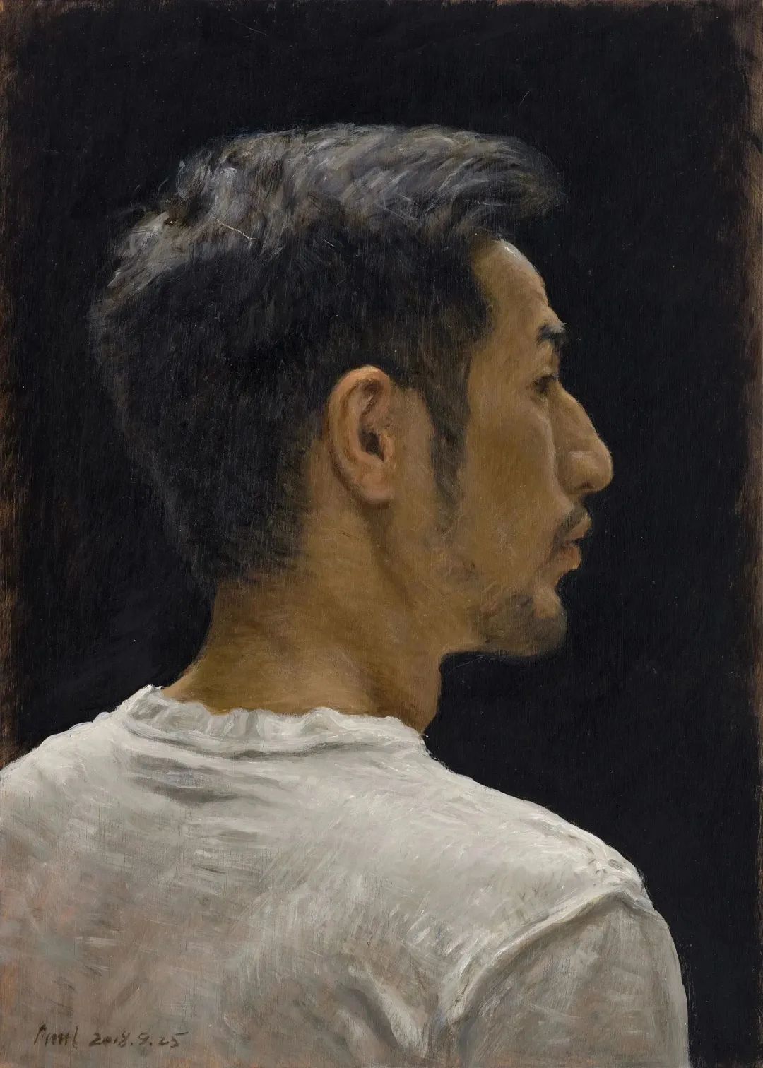 《而立之日的侧面自画像》 42x 30cm 2018年 木板油彩尤勇的肖像人物被评价为,人物“通常充满了隐蔽的激情:沉默,冷峻,似乎心事重重。”《而立之日的侧面自画像》他呈现了一个侧面的自画像,带着迷茫、冷峻。这是蕴藏在他心里想画很久的一个侧面,是他在30岁的人生节点创作,拿两面镜子画自己的侧面。他解释画中的眼神有两种矛盾的状态,“对我来讲有一种对未来的渺茫,从画中的眼神里能看出一种空,但又坚定,就有了迷茫又坚定的两种状态的张力。”