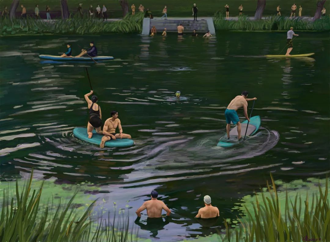 《亮马河消夏图》Ipad绘画 2022画中的深绿色调带着一种压抑感,反差的是尤勇画的是一种美好,“我画的是游泳的一条甬道,从对岸游到这边,有两个人站在这一岸等着,对岸有人下水要游过来。我还画了一个人从对岸游到这边换气的两个动作,一个是投下去之后,一个是投上来呼吸。他每游到一个地方都有浆板划过让他游过去。那就是一个简单、热闹又互相友爱的生存空间。”