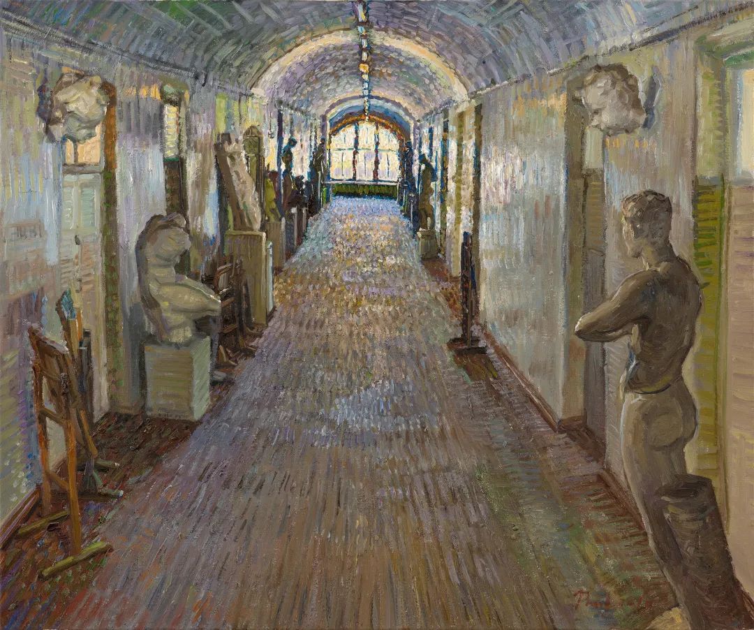 《通向光明的走廊》 2010 布面油彩 50x65对他很有冲击的是,几年前母亲退休来到北京,被他鼓励开始创作,毫无基础,但成功颇丰,今年举办了个展。“她画画的状态是对的。画画最核心的东西,不是技术,也不是知识,而是心灵中美感的流露。”