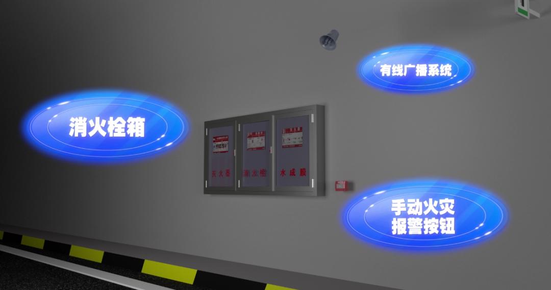 隧道内右侧壁每隔50米设有一处手动火灾报警按钮、消火栓箱以及有线广播系统。