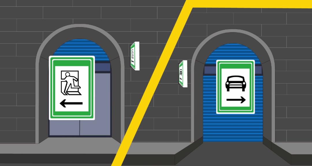 隧道内的安全通道分为人行和车行两种,人行横洞一般250米设置一处,车行横洞一般750米设置一处,分别设置有指示牌。