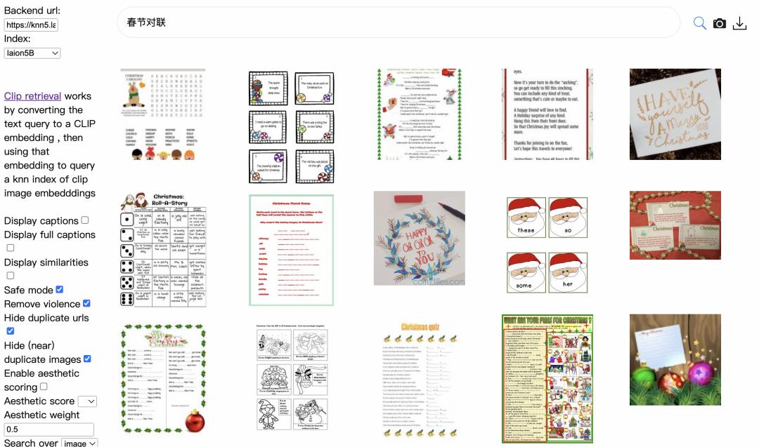 但很可惜的是,OpenAI CLIP 的预训练主要使用英文世界的图文数据,不能天然支持中文。即便是社区有研究者通过翻译的文本,蒸馏出多语言版本的 Multilingual-CLIP (mCLIP),同样无法很好满足中文世界的需求,对于中文领域的文本理解不很到位,比如搜索“春节对联”,返回的却是圣诞相关的内容: