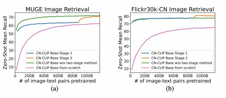 在 MUGE 中文电商图文检索、Flickr30K-CN 翻译版本通用图文检索两个数据集上观察 zero-shot 随着预训练持续进行的效果变化趋势