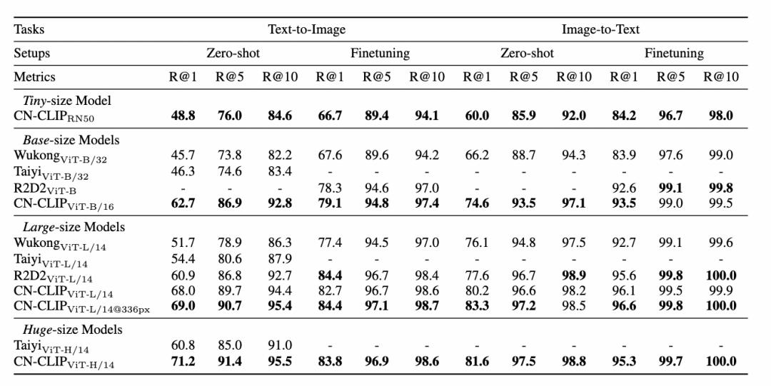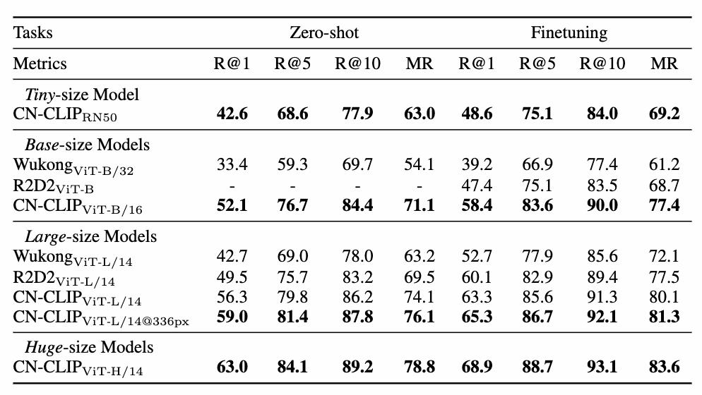 多项实验数据表明,Chinese-CLIP 可以在中文跨模态检索取得最优表现,其中在中文原生的电商图像检索数据集 MUGE 上,多个规模的 Chinese CLIP 均取得该规模的最优表现。而在英文原生的 Flickr30K-CN 等数据集上,不论是零样本还是微调的设定下,Chinese CLIP 均能显著地超出国内 Wukong、Taiyi、R2D2 等基线模型。这在很大程度上归功于 Chinese-CLIP 更大规模的中文预训练图文语料,以及 Chinese-CLIP 不同于国内现有一些图文表征模型为了最小化训练成本全程冻结图像侧,而是采用两阶段的训练策略的做法,以更好适配中文领域: