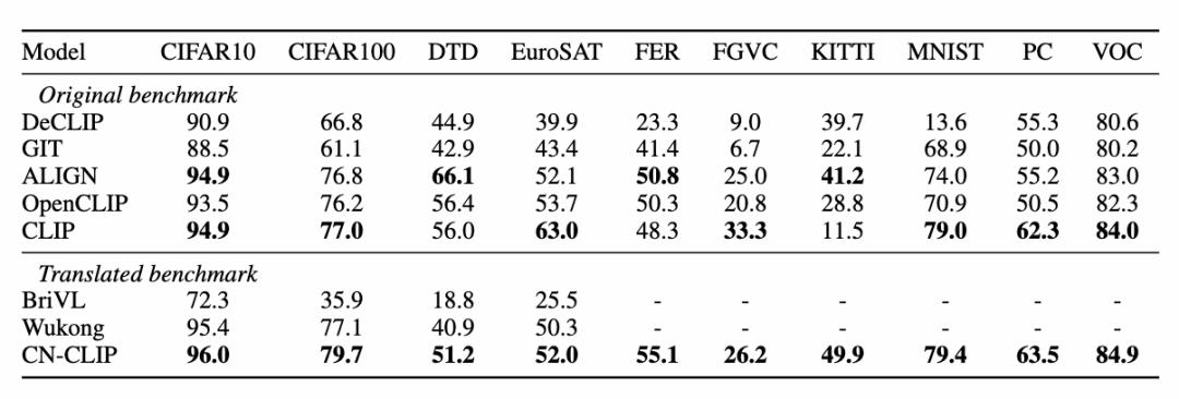同时,研究人员在零样本图像分类数据集上验证了中文 CLIP 的效果。由于中文领域比较权威的零样本图像分类任务并不多,研究人员目前在英文翻译版本的数据集上进行了测试。Chinese-CLIP 在这些任务上,通过中文的 prompt 和类别标签,能够取得和 CLIP 相当的表现: