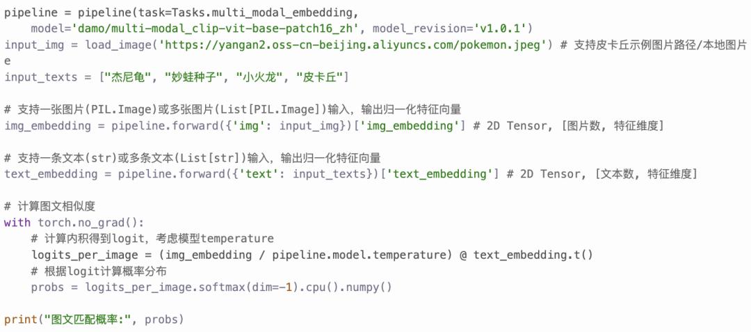 如何才能用上 Chinese-CLIP ?很简单,点击文章开头的链接访问魔搭社区或使用开源代码,短短几行就能完成图文特征提取和相似度计算了。如需快速使用和体验,魔搭社区提供了配置好环境的 Notebook,点击右上方即可使用。