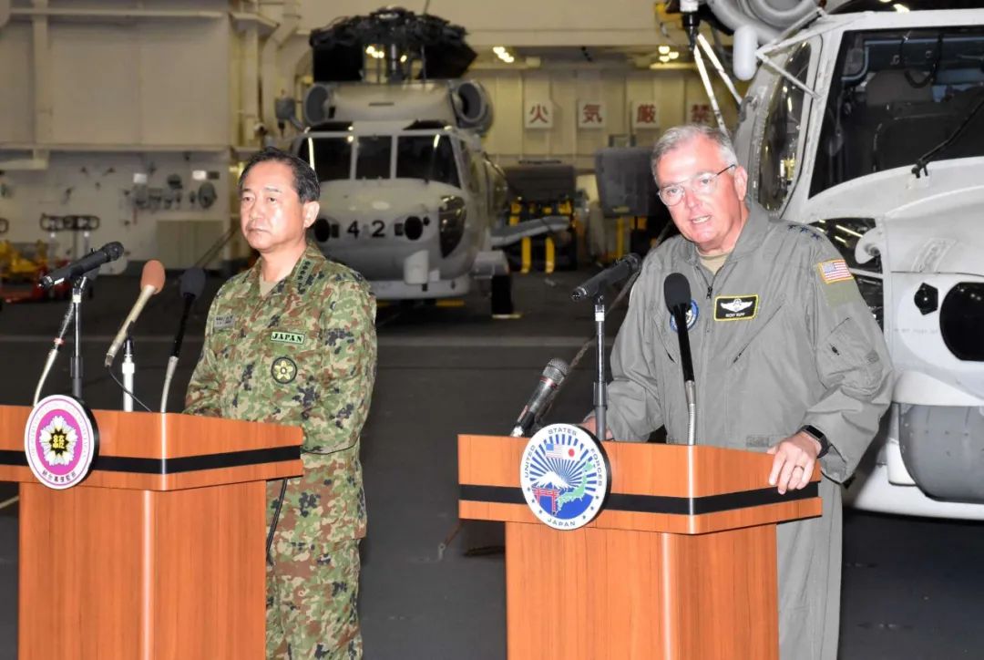 ▲ 2022年11月,日本自卫队统合幕僚长山崎幸二和驻日美军司令瑞奇·鲁普在自卫队“出云”号准航母上共同举行“利剑23”联合军演的记者见面会。“好战穷兵,未有不亡者也。”日本应冷静思考,通过发展军事实力追求大国目标是否可行,是否真正符合日本的长远利益?在美国默许纵容之下的军事松绑,到头来不过是更加紧密地绑定美国的地缘战略,难道这样就能实现日本保守势力孜孜以求的“正常国家”?