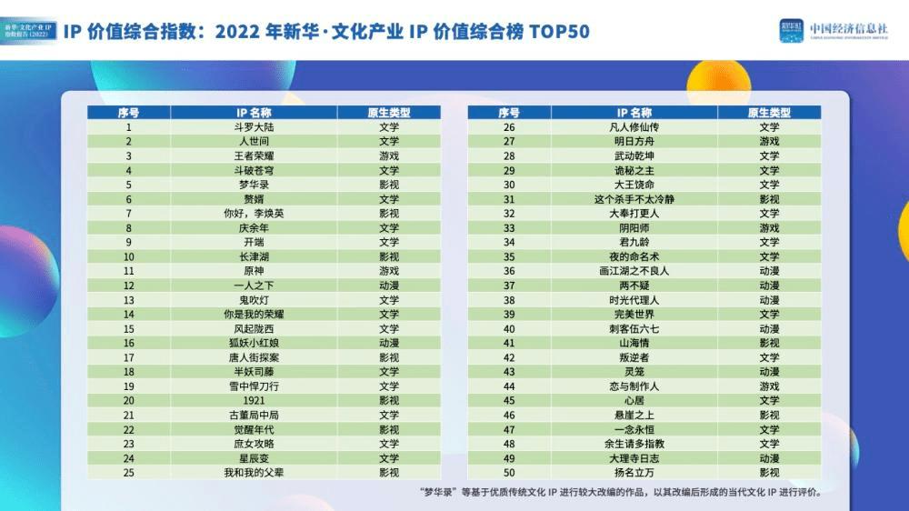 因此,IP不是扁平和孤立的。好的IP是呈现出一个立体化的金字塔结构的,价值观是底层支撑,往上是人物角色、故事,最上是商业变现,经过持续的探索迭代,《斗罗大陆》IP正是金字塔式的呈现。总的来看,《斗罗大陆》凭借独特的IP价值属性、视频平台的生态构成树立了一个成功的国漫IP开发新样板。《新华文化产业IP指数报告(2022)》,在“文化产业IP价值综合榜TOP50”中,《斗罗大陆》位居榜首。