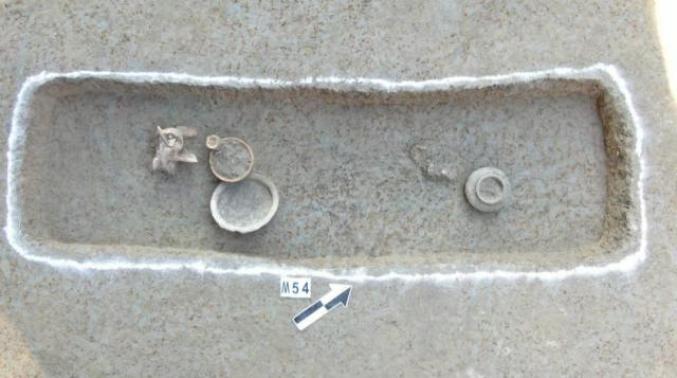 M54良渚文化早期墓葬 东-西遗址的主体为良渚文化时期的人工堆筑土台,堆积以黄斑土为主,因晚期破坏而分为两个片区,土台分布面积约8000平方米。其中G14从西北-东南方向延伸,贯穿整个遗址,是遗址中良渚文化早期延续至晚期的最重要的遗迹,出土了大量的陶器、石器,少量玉器和动物骨骼。
