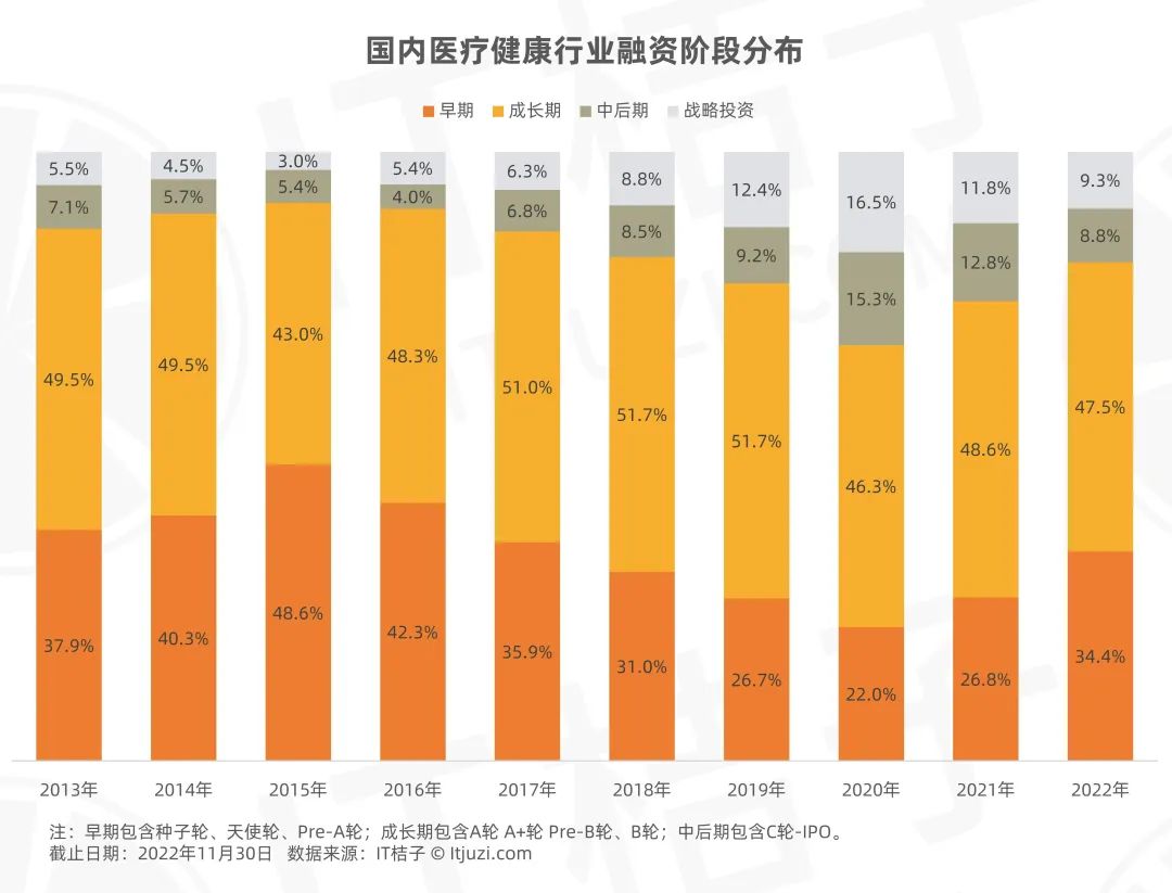 IT 桔子将一级市场融资阶段分为早期融资、成长期融资、中后期融资以及战略投资。早期融资包含种子轮、天使轮及 Pre-A 轮;成长期为 A 轮到 B 轮阶段;中后期则为 C 轮到 IPO 阶段。医疗健康行业一级市场融资一半左右在成长期阶段。