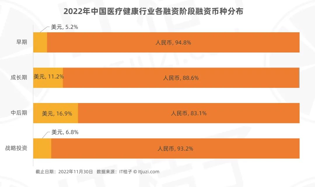 据 IT 桔子统计,2022 年医疗健康行业超 90% 均为人民币融资,分融资阶段来看,中后期融资阶段,美元融资占比增加,达到 16.9%;成长期美元融资占比 11.2%;医疗健康行业早期融资一般以人民币为主,占比近 95%;战略融资中,人民币占比也高达 93.2%。