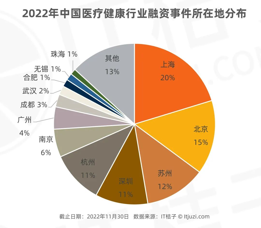 2022 年医疗健康领域融资事件最多的地区为上海,超 190+,占比达到 20%。位于上海市的凯莱英生物,在 2022 年 3 月获 23.45 亿战略投资;获 1.6 亿美元 B 轮融资的方拓生物同样也坐落在上海市。