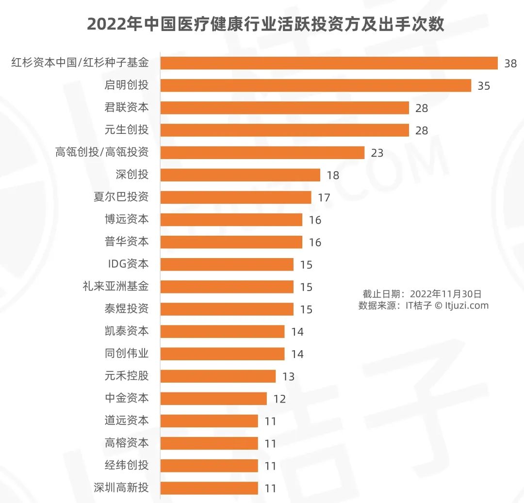 红杉中国/红杉种子基金 2022 年在医疗健康领域出手 38 次。基因治疗药物研发商方拓生物;人工智能驱动药物制剂开发商剂泰医药;创新型体外诊断技术和产品研发商颐坤生物背后都有红杉中国的身影。
