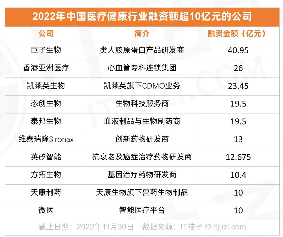 类人胶原蛋白产品研发商巨子生物为 2022 年获得融资最多的医疗健康公司,为 40.95 亿元;排在之后的为心血管专科连锁集团香港亚洲医疗,其在 2022 年合计获 26 亿元融资,较巨子生物差 14 亿元;凯莱英生物今年获 23.45 亿元,与第二名差距缩小;生物科技服务商态创生物和血液制品与生物制药商泰邦生物在今年均获 19.5 亿元融资。