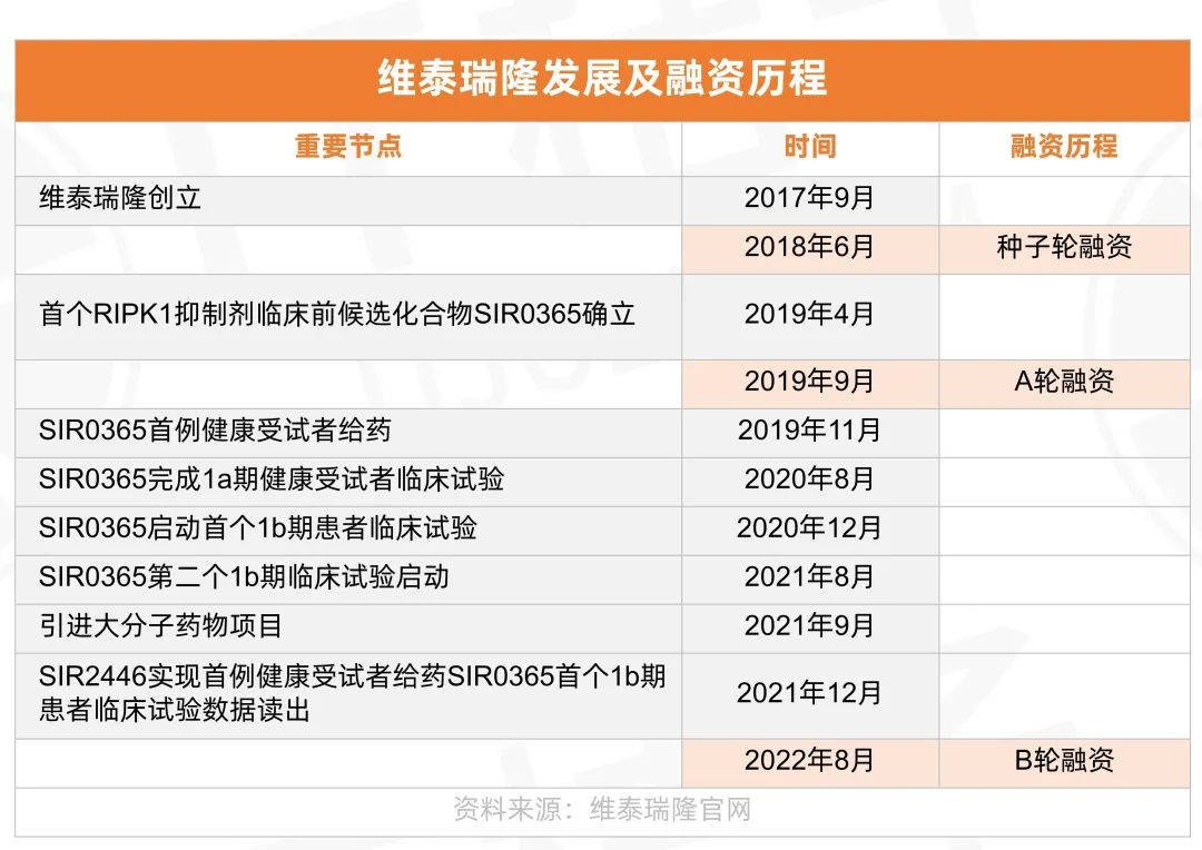 一级市场融资方面,成立于 2017 年的维泰瑞隆在第二年 6 月即获种子轮融资,2019 年 9 月又完成 1 亿美元 A 轮融资,淡马锡、Invus、F-Prime Capital Partners、斯道资本 (富达亚洲)、Arch Venture Partners、险峰旗云为参投方。今年维泰瑞隆再获云锋基金、高榕资本领投,淡马锡等跟投的 2 亿美元 B 轮融资。据悉,此轮融资将用于受体相互作用蛋白激酶 1 (RIPK1) 抑制剂的临床开发,并进一步扩大公司研发规模、拓展研发管线,针对衰老相关退行性疾病开发各项潜在同类最佳/同类第一的候选药物。此轮融资后,维泰瑞隆估值达 16 亿美元,成为独角兽。