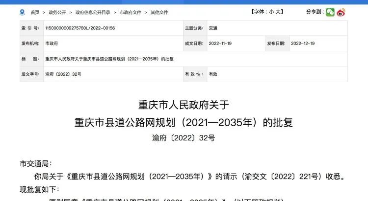 12月19日,重庆市人民政府印发了关于重庆市县道公路网规划(2021—2035年)(以下简称《规划》)的批复渝府〔2022〕32号。