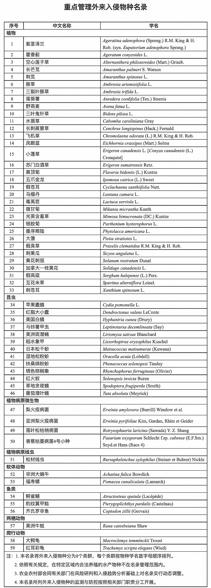 根据《中华人民共和国生物安全法》,农业农村部会同自然资源部、生态环境部、住房和城乡建设部、海关总署和国家林草局组织制定了《重点管理外来入侵物种名录》,现予以发布,自2023年1月1日起施行。