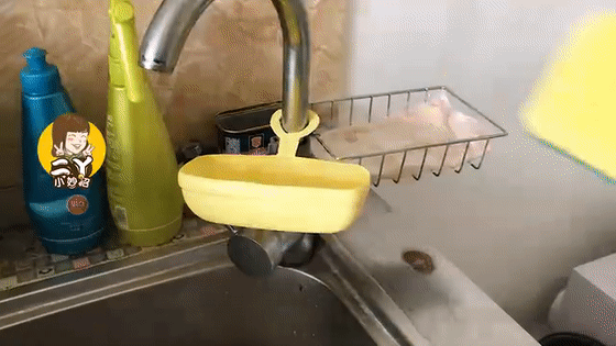 把改造后的沥水盒挂到洗碗槽的水龙头上,用完的百洁布和钢丝球可放里面沥干水。