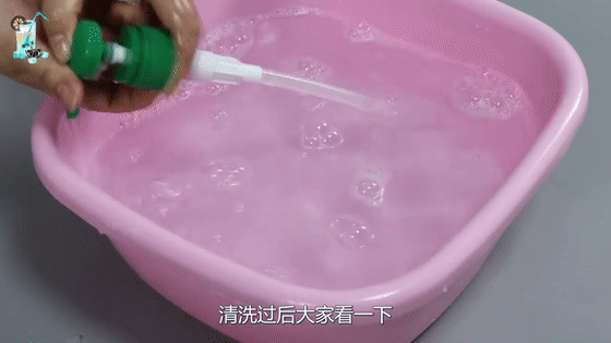 第二步:不断的挤压压嘴,把残留在压嘴里的洗洁精全部冲洗出来。之后再换清水,多挤压冲洗几次,直到水里没有泡沫,压嘴彻底清洗干净为止。