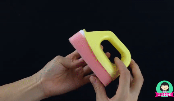 第二步:取一块百洁布塞在这个提手里,然后裁剪掉多余的部分,尖角的地方修成圆弧形。