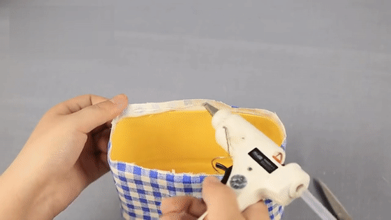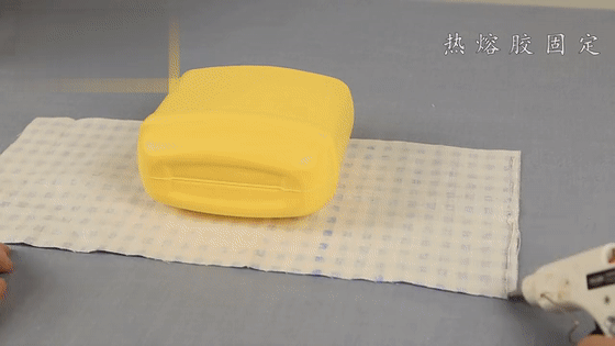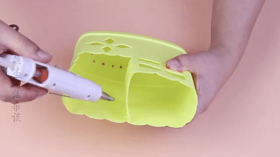第三步:在提手内部的边边上打热熔胶,将百洁布粘在提手里,增加稳固。