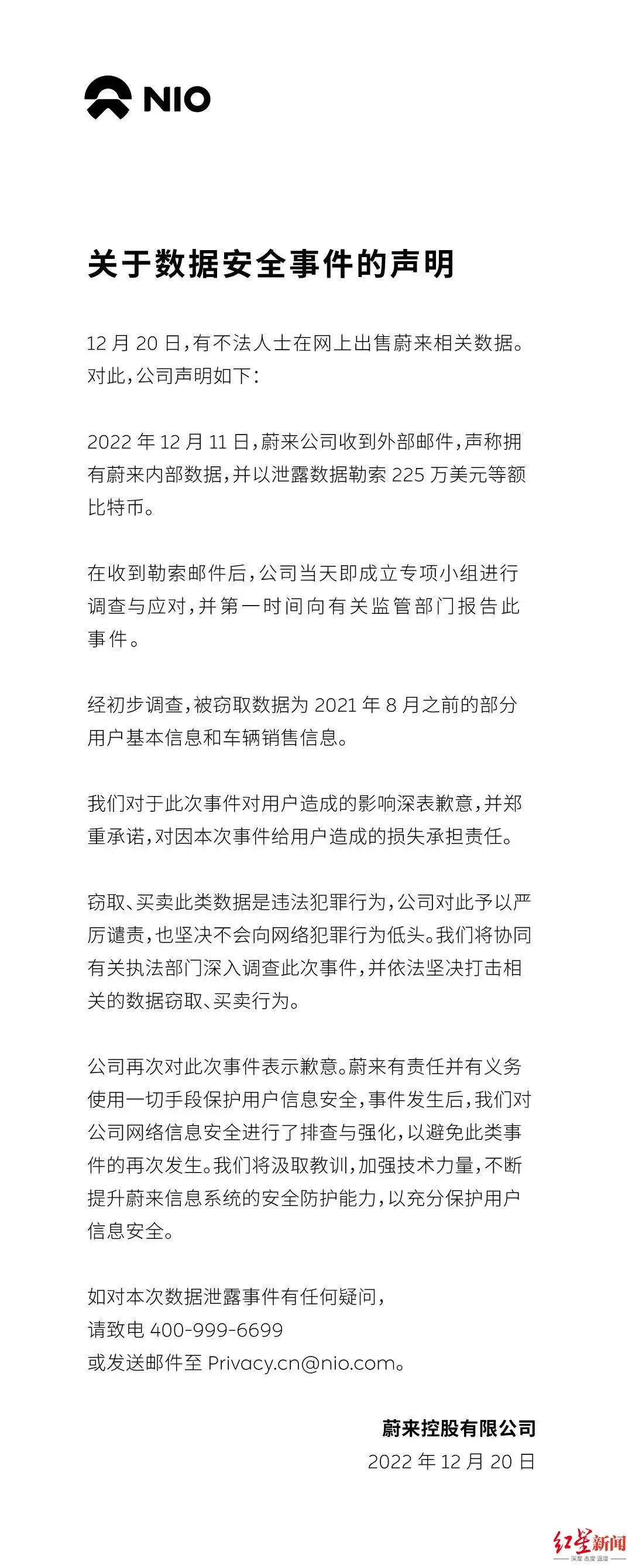12月20日,蔚来(09866.HK/NIO.US)首席信息安全科学家、信息安全委员会负责人卢龙在蔚来官方社区发布公告称,12月11日,公司收到外部邮件,声称拥有蔚来内部数据,并以泄露数据勒索225万美元等额比特币。