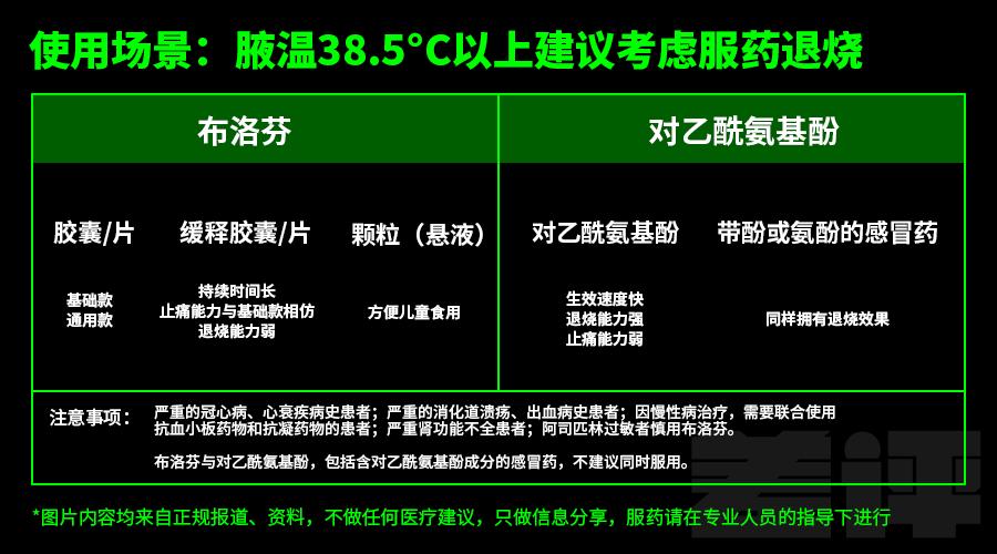 话说回来,对于布洛芬,大家还是要秉承是药三分毒的观念,不是发热就要吃退烧药,一般在腋温高于 38.5 ℃才考虑吃药,而且吃的时候尽量按照推荐剂量来食用。